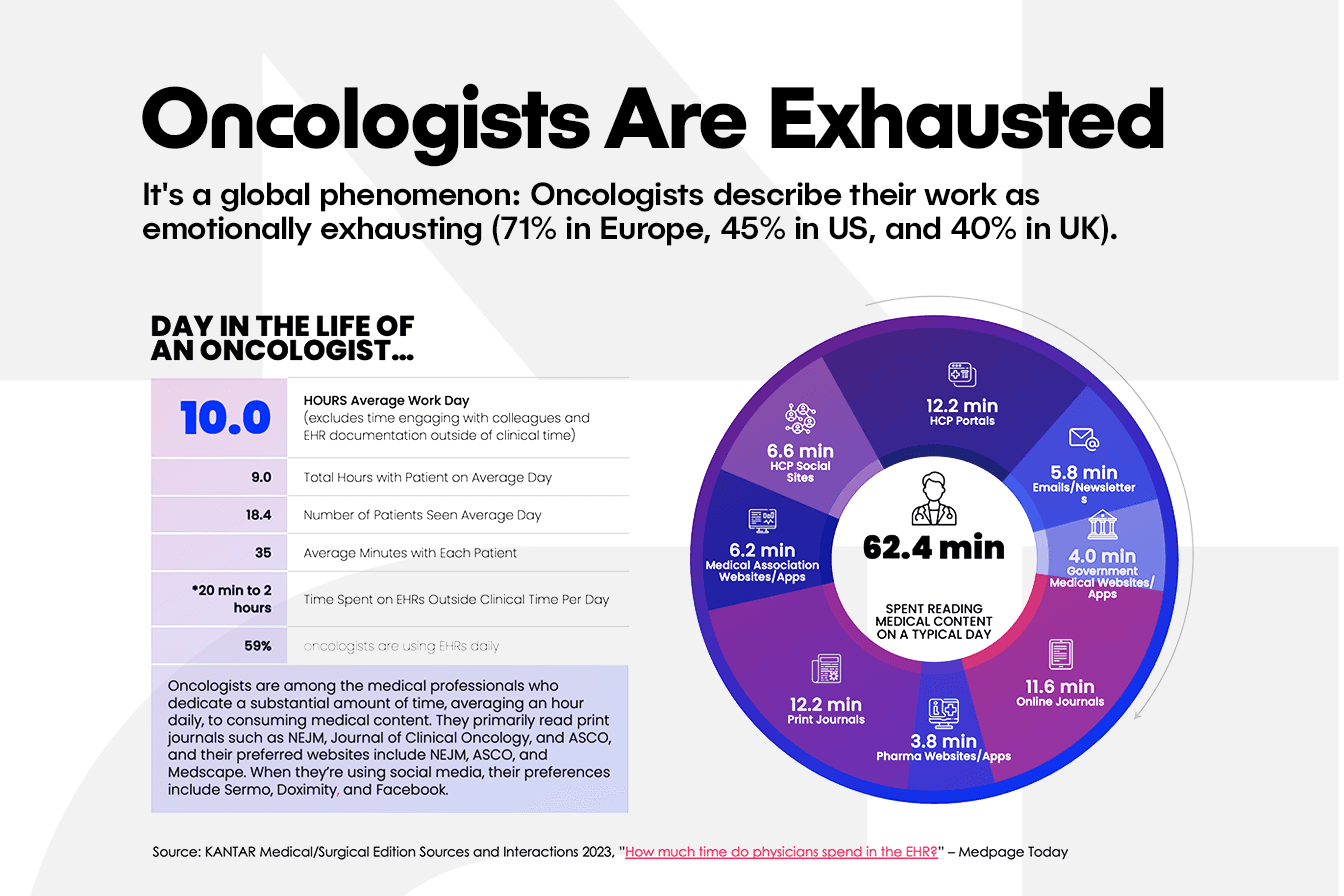 Oncologists navigate a daily workload that leaves little time for traditional engagement. On average, they work 10 hours a day, see over 18 patients, and dedicate just 35 minutes per visit. Outside the clinic, they spend an additional two hours on EHR tasks and still carve out more than an hour to consume medical content—primarily through trusted sources like NEJM, JCO, Medscape, ASCO, and, increasingly, medical podcasts. So, it’s no wonder that oncologists are facing high rates of burnout.