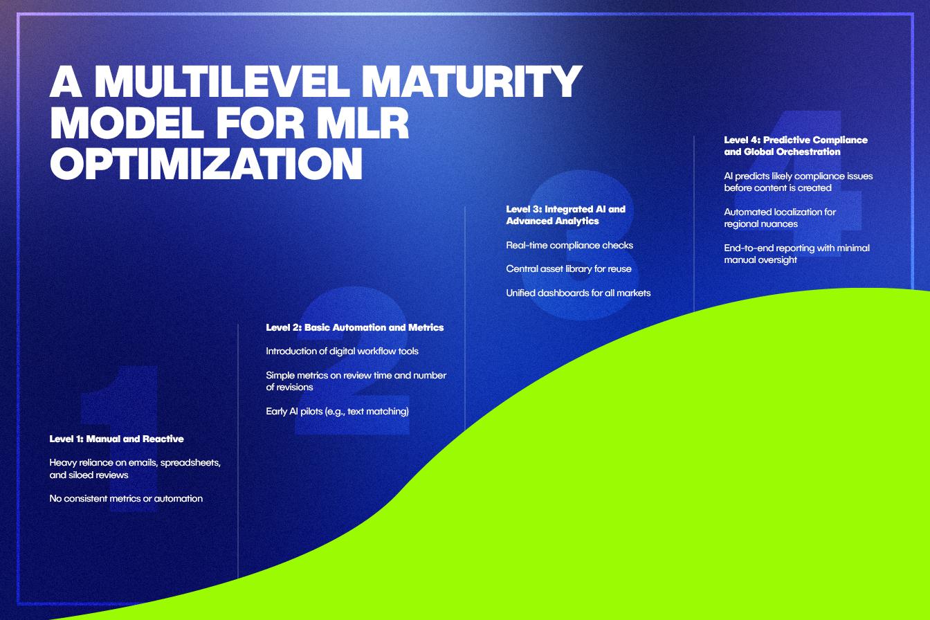Organizations can assess where they currently stand and chart a path toward advanced integration of AI and automation in MLR processes: