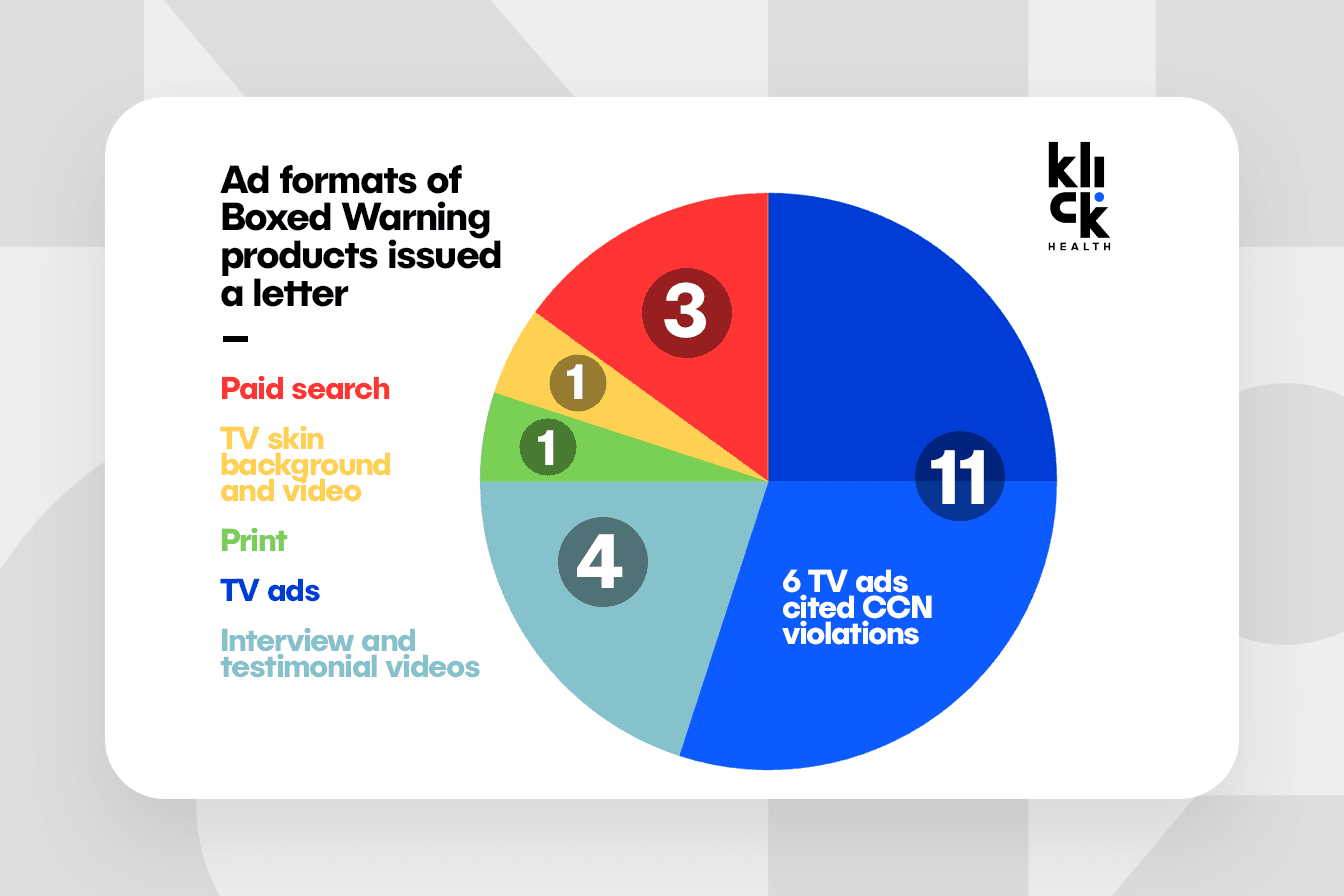 The letters covered a diverse mix of assets, with the majority directed at TV ads, followed by interview videos and paid search, with the latter skewing more heavily toward being issued Warning Letters.
