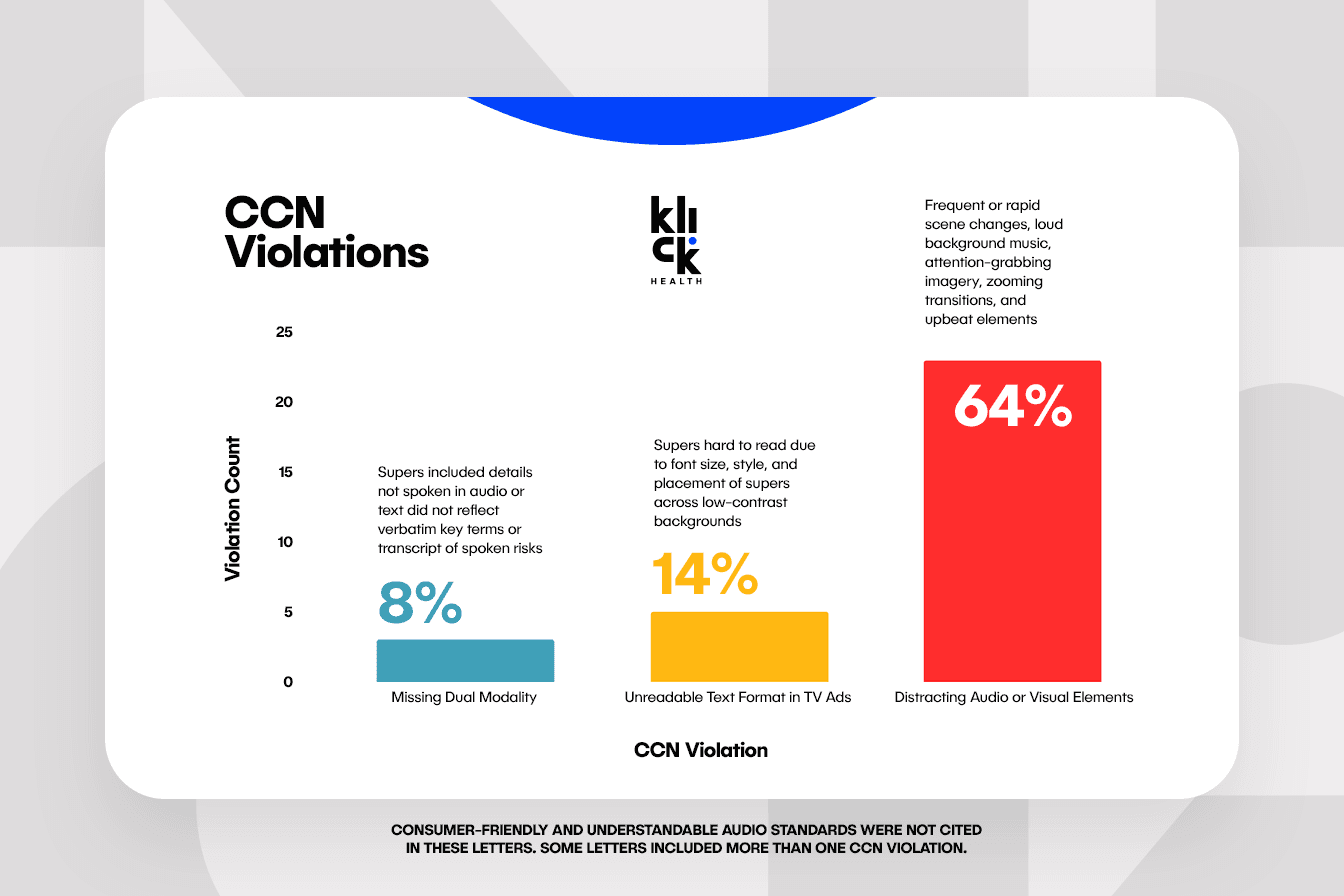 This is the first set of Untitled and Warning Letters issued after the CCN guidance, which provides clear insight into the FDA’s priorities, with particular emphasis on eliminating distractions during the major statement, a requirement that a TV or radio ad must prominently present the drug’s most important risks fulfilling the CCN standards. Notably, the vast majority of TV ads cited had at least one CCN violation.