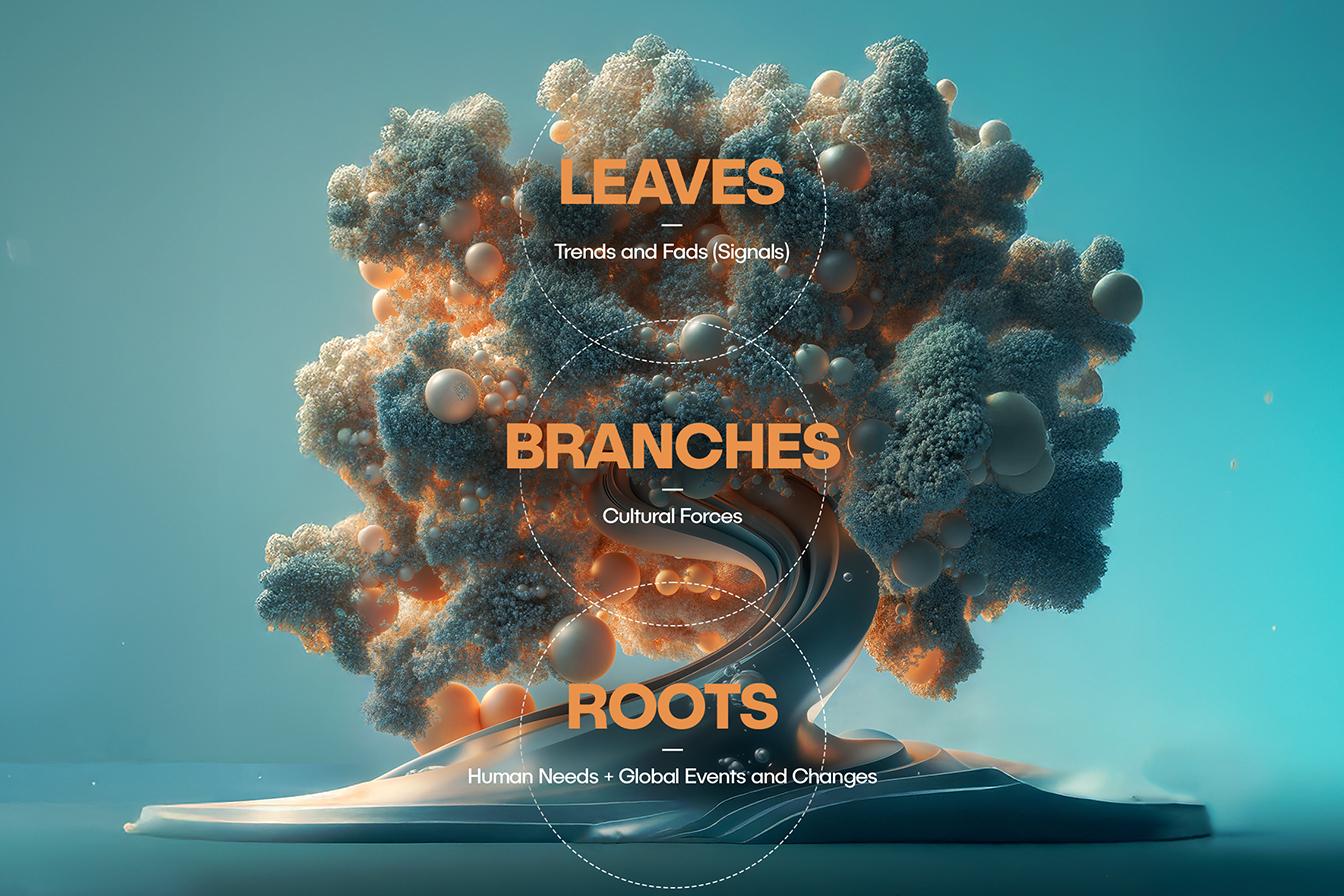 In our model, the signals that are easiest to see are the Leaves. These signals and fads represent a moment in time. They may disappear quickly, but they tell us something important about what’s happening in culture. Trend-hunting organizations often report on these signals, and sometimes, a fad rises to mass-media attention—a TikTok format like “brat Summer” or a trend connected to a big event like the movie Wicked. Our team observes, tracks, and catalogs these trends and fads throughout the year to help us see the emerging patterns.