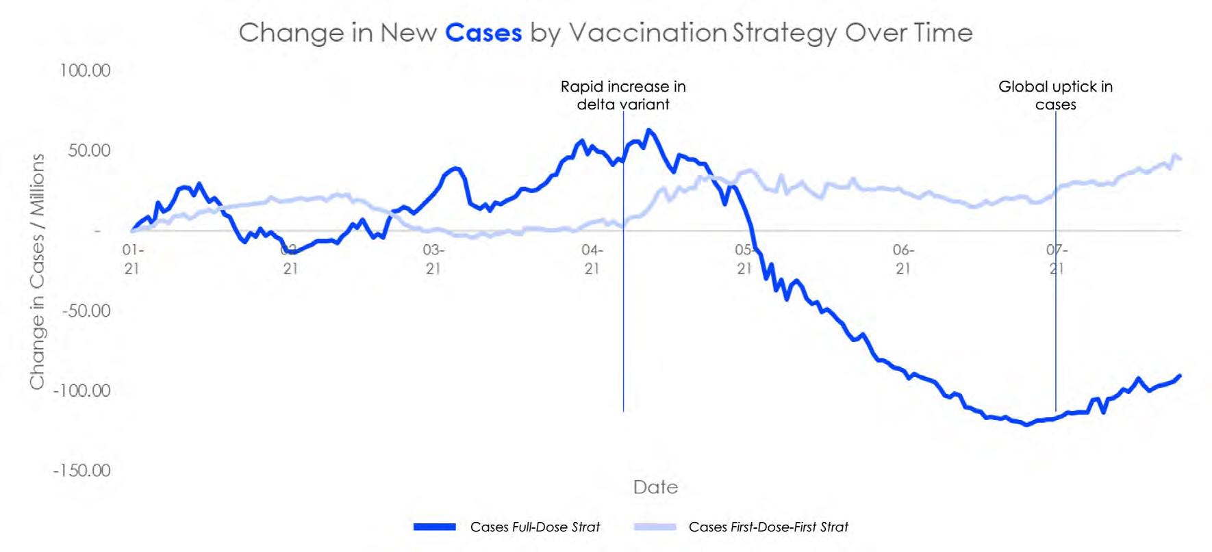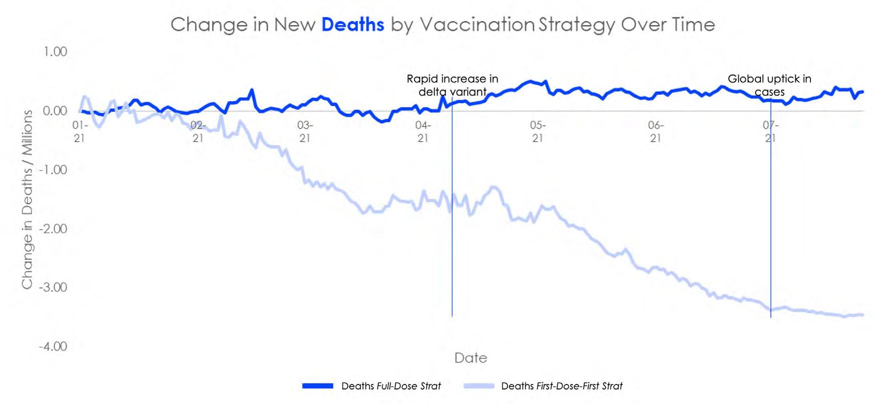 What is of note in Figure 1 is the similarity in the change in cases prior to the emergence of the delta variant and the drastic difference afterwards. The First-Dose-First strategy made sense prior to the new variant but it is no longer as effective. In Figure 2 we see that in contrast to the case rates, the death rates were always more successfully curbed in countries following the Full-Dose strategy. This was exacerbated after the expansion of the spread of the delta variant in early April.