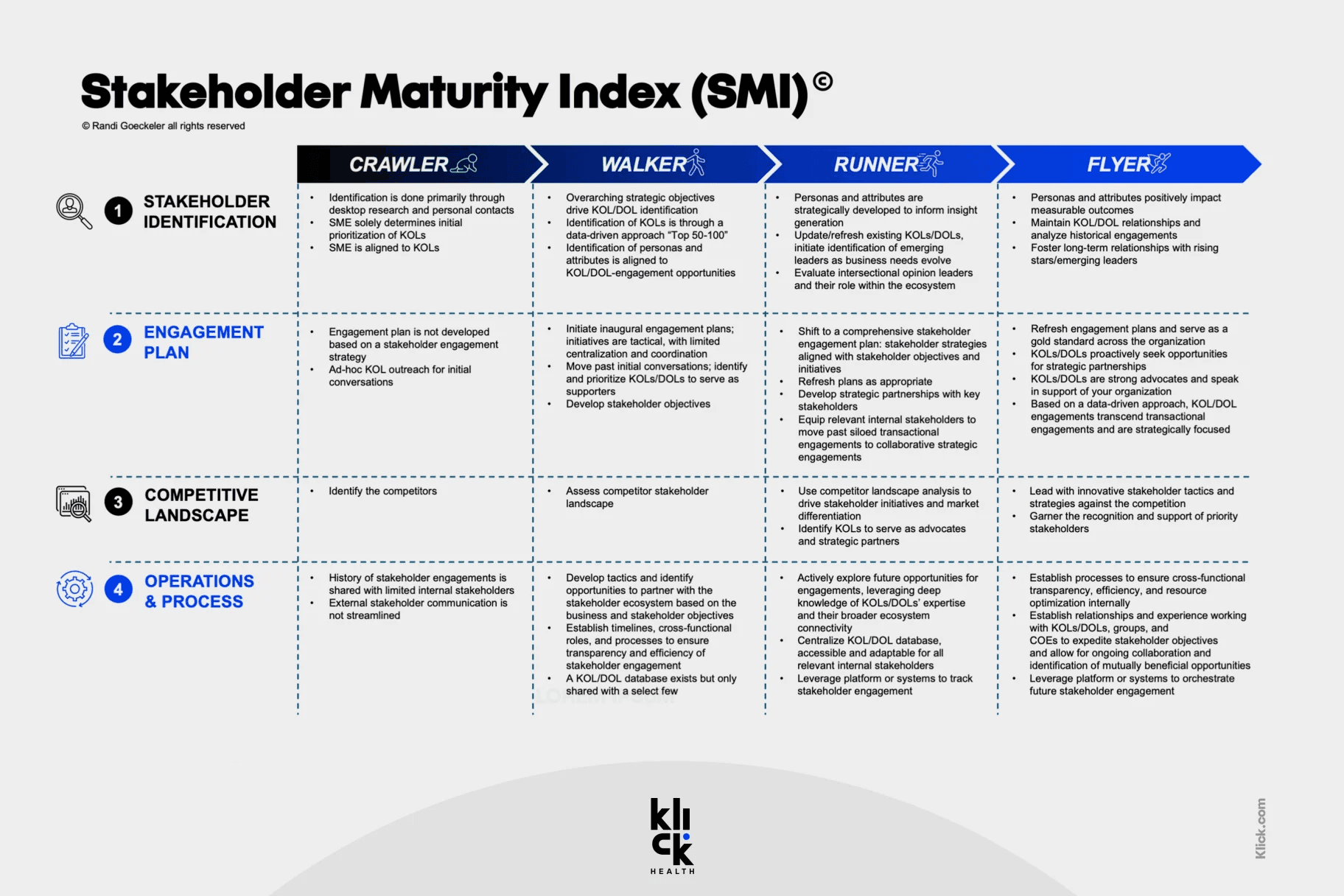 To gauge the industry’s readiness for this shift, Klick developed the Stakeholder Maturity Index (SMI), a proprietary framework that evaluates an organization’s KOL engagement capabilities across four key pillars: