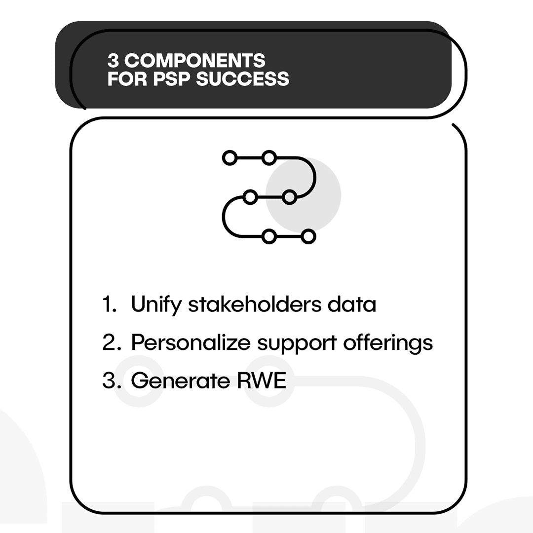 To build a successful PSP, it’s essential to unify stakeholder data across the healthcare ecosystem, provide personalized support offerings tailored to individual patient needs, and ensure the program is designed to generate real-world evidence. These three core elements lay the foundation for not only improving patient outcomes but also contributing valuable insights into treatment effectiveness, patient behaviors, and healthcare utilization trends.