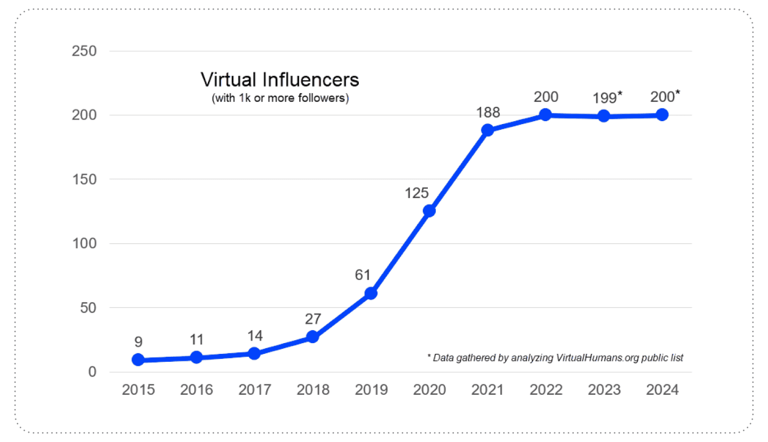 The Virtual Humans site has been tracking “real” virtual influences (with 1,000 or more followers) since 2019 and has some insight into its growth. Interestingly, while the hype around virtual influencers is taking off, the number of actual entities with substantial followings is slowing down.