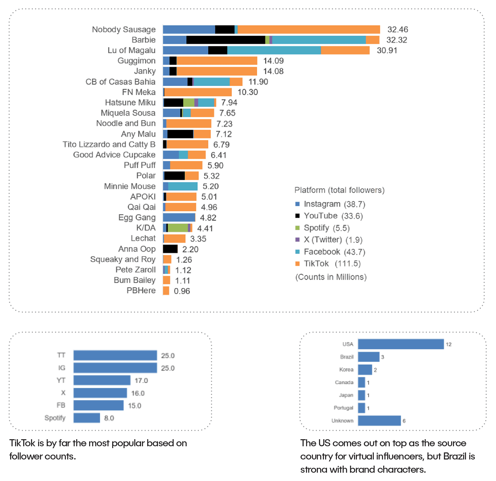 We looked at the top virtual characters and influencers with over one million combined followers and found their rankings to be as follows: